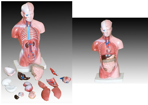 這是一款受歡迎的教學模型,顯示15件內臟:軀干,腦(2件),心,食管氣管和主動脈,肺(4件),頭顱蓋,胃,橫膈膜,肝,胰和脾,腸。用PVC制成,安放于塑料座上。尺寸:26 CM。
