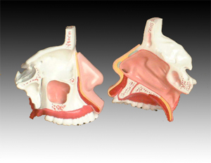 本模型適用于中等學校講解生理衛生課程時作直觀教具用。使學生了解鼻腔的內部構造。顯示:1,外鼻:示鼻骨及鼻軟骨的切面。2,鼻腔:外側壁有上、中、下三個鼻甲突入鼻腔,形成上、中、下三個鼻道。3,鼻副竇:示額竇、蝶竇和上頜竇。本模型按實物放大1/2倍。用PVC制成。
