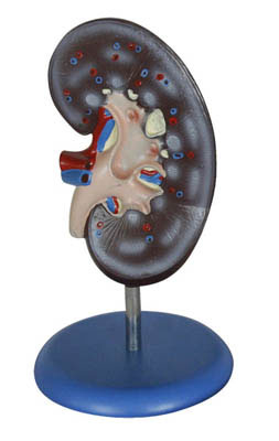 本模型適用于中等學校講解人體解剖有關泌尿器官課程時作直觀教具用。右腎作額狀切面,示腎門、腎血管、輸尿管和腎盂、腎實質分髓質及皮質、錐體、乳頭等。用PVC制成,安放于塑料座上。本模型放大2倍,尺寸: 20x10x7CM。