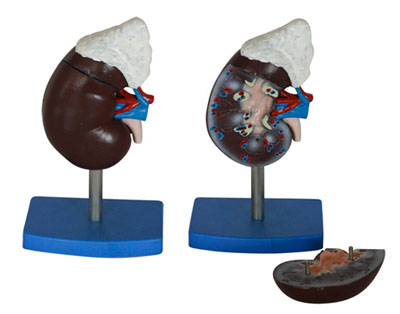 本模型適用于講解人體解剖有關(guān)泌尿器官課程時(shí)作直觀教具用。顯示腎的形態(tài)和結(jié)構(gòu):腎,腎上腺,腎管和腎上腺管,輸尿管的上部等。模型可取下供仔細(xì)研究。自然大小,分成2件。