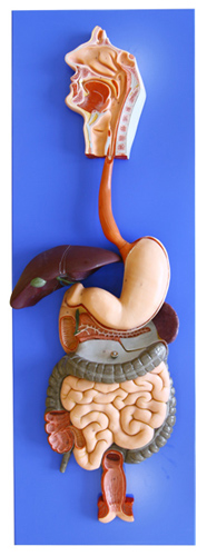 這是一款消化系統的立體模型,實物大小。展示:鼻,口腔和咽喉,食道,胃腸道,肝與膽囊,脾和胰,十二指腸、盲腸和直腸開放。分成3件,置于基板上。